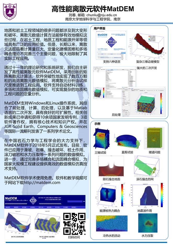 MatDEM采用创新的GPU矩阵计算法和三维接触算法,实现了每秒1500万次三维单元运动计算(二维4000万),计算单元数和计算速度达到了国外商业软件的30倍以上(300万三维单元,1000万二维单元)。软件实现了自动堆积建模,分层赋材料,节理面和荷载设置,丰富的后处理功能和二次开发等。研究生通过简单学习即可完成地质和岩土工程大规模离散元模拟。