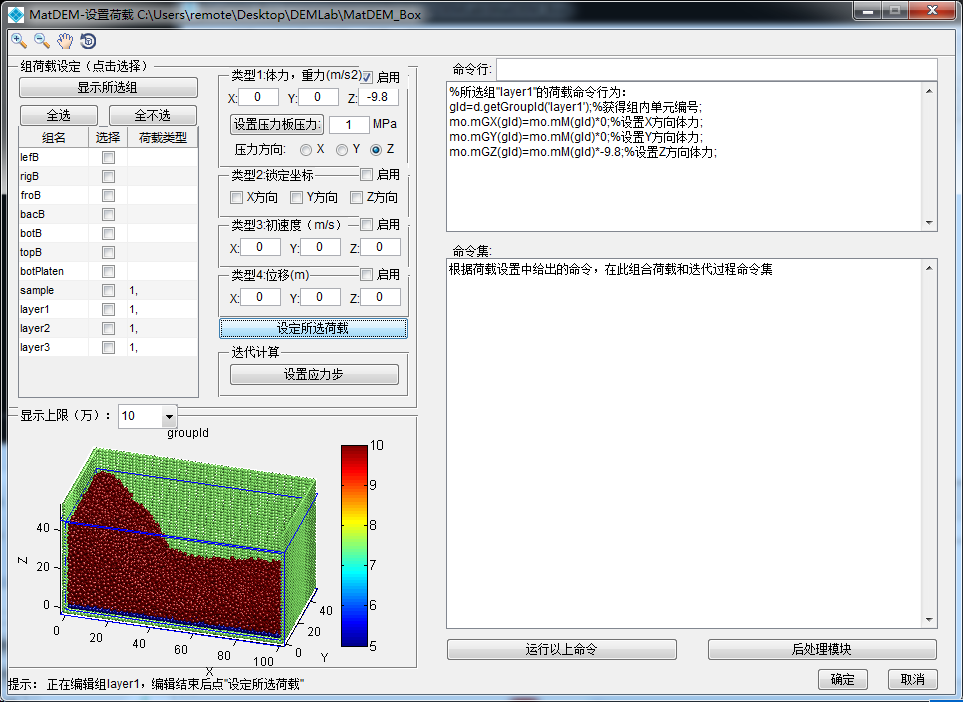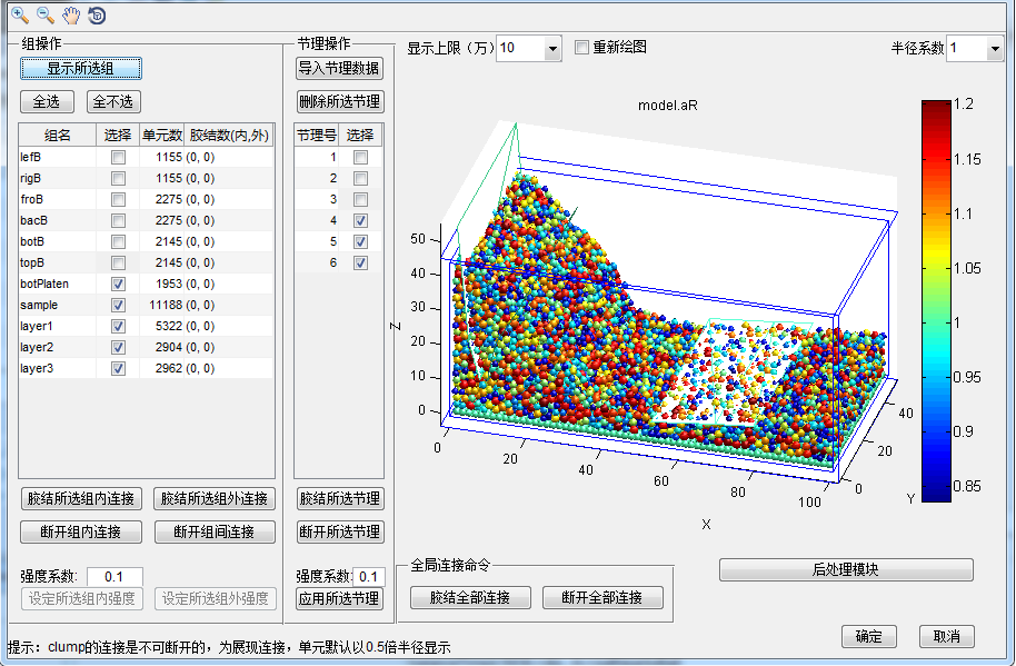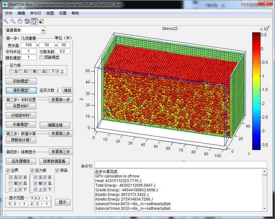 数值试验室对应于user_3AxialNew二次开发示例,用于结合代码了解MatDEM建模过程。,目前可实现常规三轴,固结和单轴压缩试验。用于研究岩土体的微宏观力学性质。右下方命令行处可见,MatDEM每秒完成310万次颗粒三维运动计算(目前已达到1400万)。三维模拟单元数量上限150万,二维450万。这个模块对应着主程序中二次开发代码user_AxialNew1-3三个文件。