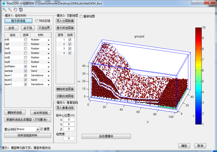 数值模拟器对应于user_BoxModel二次开发示例,用于结合代码了解MatDEM建模过程。包括“几何建模”,“材料设置”,“数值计算”,“结果显示”四部分。这个模块对应着主程序中二次开发代码user_BoxModel1-3三个文件。为说明方便,采用3万单元三维模型进行演示。