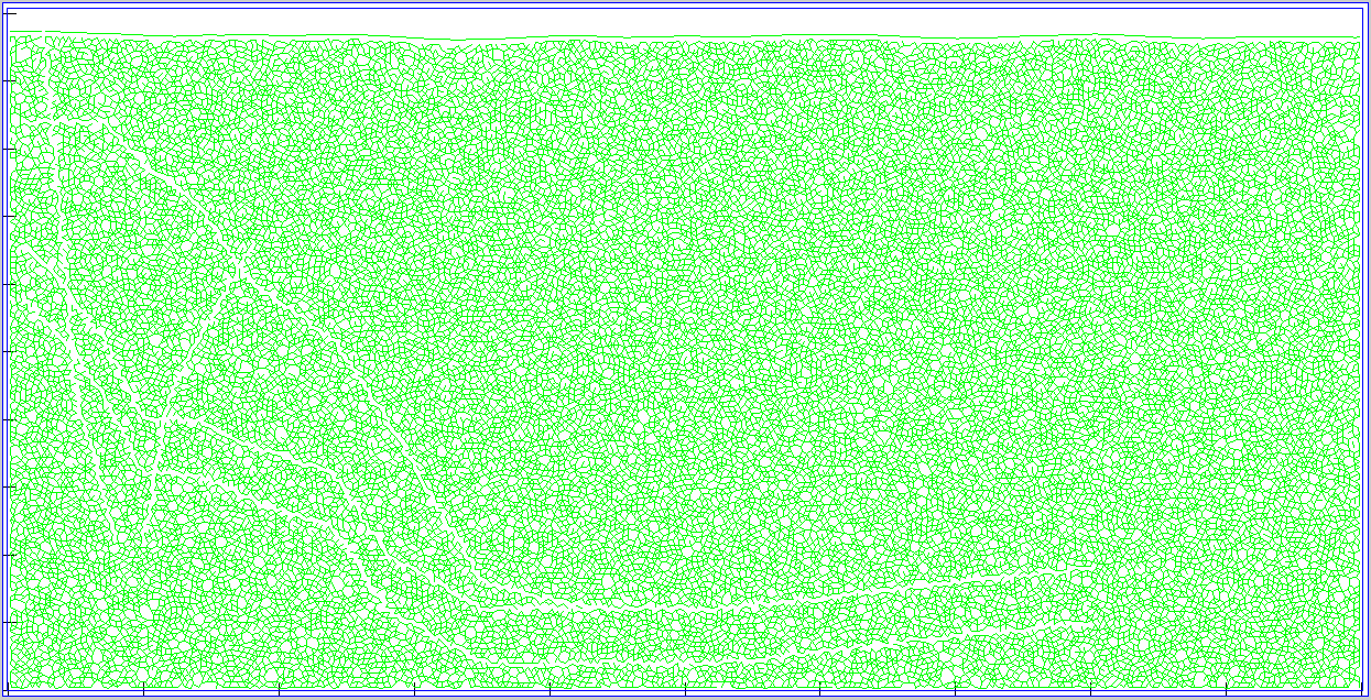 3万单元二维模型和节理面。颗粒单元未显示,仅显示胶结连接。绿色线段代表胶结,空白为节理。